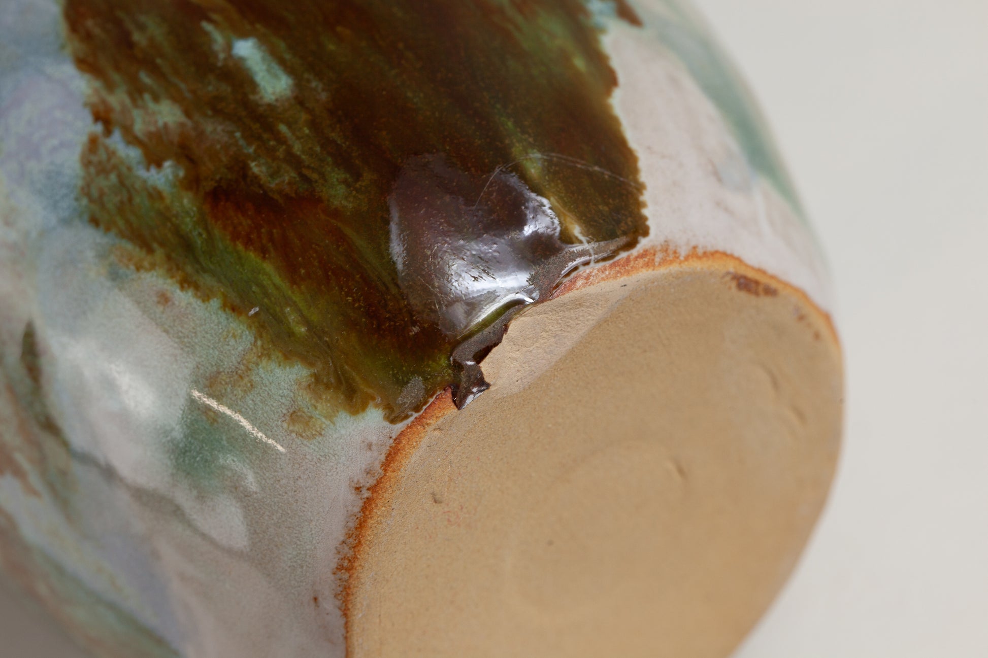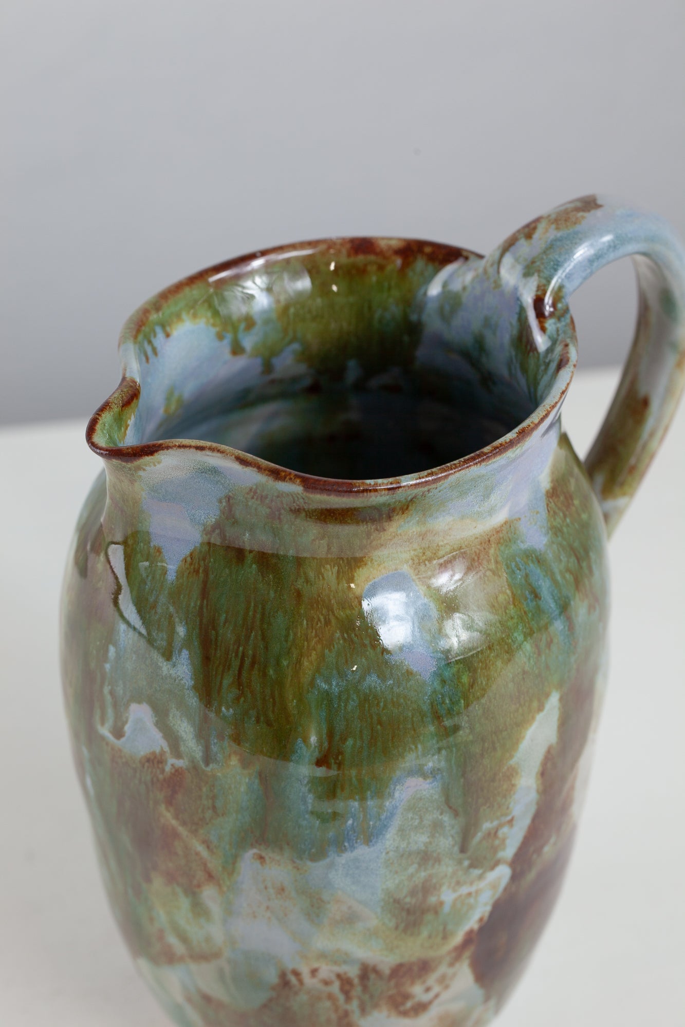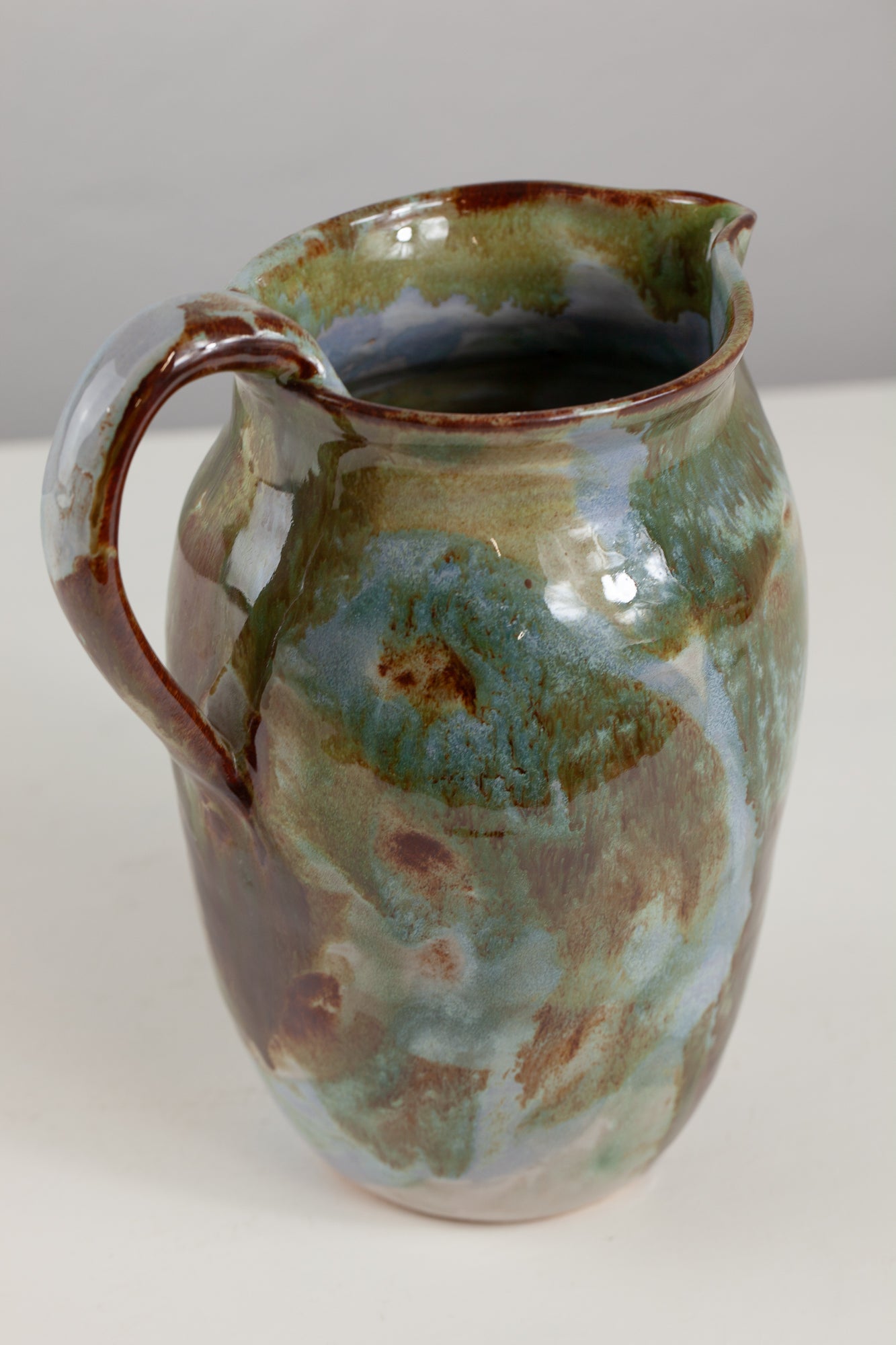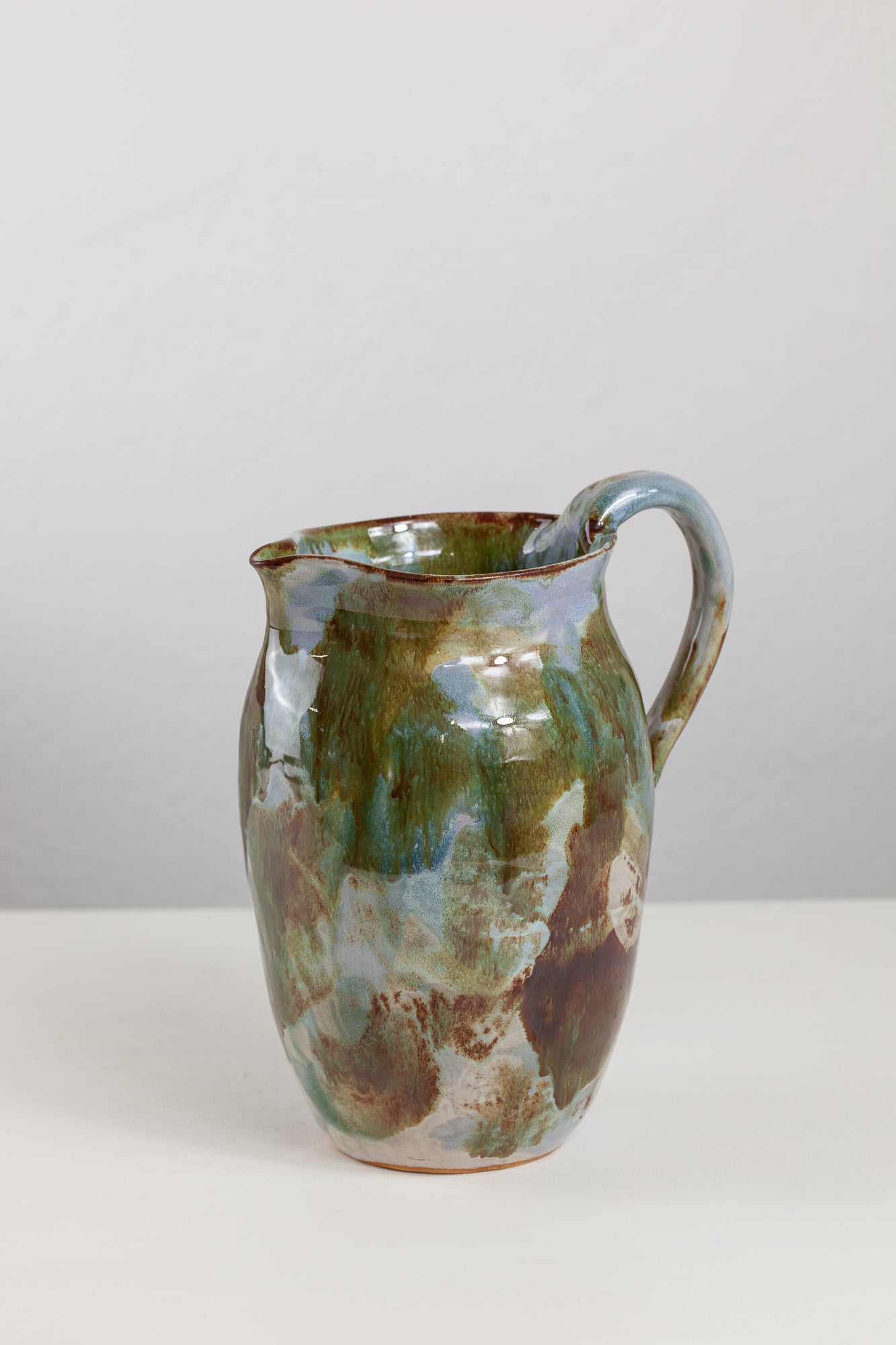 Caraffa in grès beige con smaltatura a pennello con vari smalti. Lieve difetto estetico sulla base (visibile in foto)