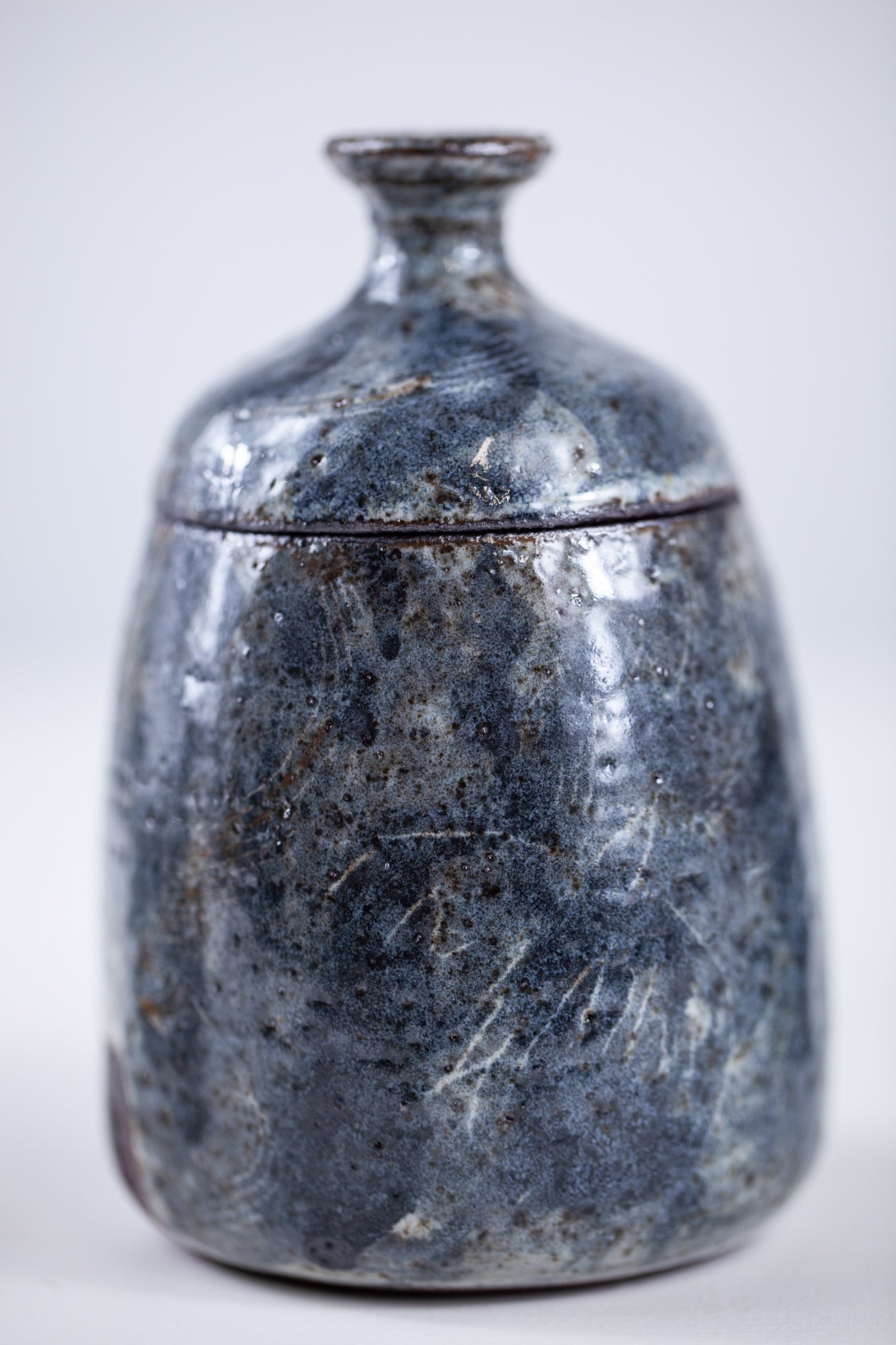 Contenitore in grès rosso con smaltatura bianca e decorazioni ad ossido.
